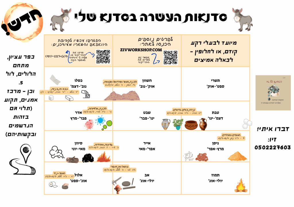 התחייבות לשנה. שמירת מקום ביום לבחירתכם. ניתן להשלים העדרויות ללא תשלום נוסף. ניתן לשנות או לתאם יום אחר במידת הצורך. המחירים כוללים חומרים ושריפות.